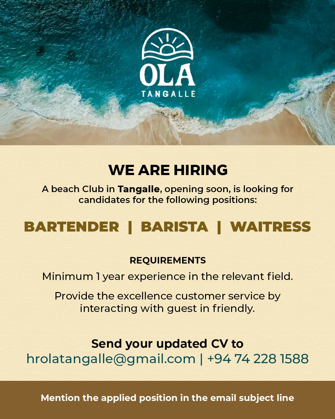 Ola – Tangalle Beach Club is looking for a talented Barista to join our beachside crew. If you love crafting the perfect coffee and serving it with a smile, come be part of a vibrant, oceanfront experience. Great vibes, great team, and coffee with a view — every day.