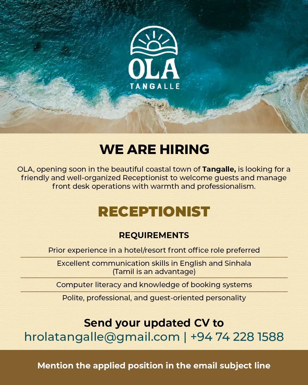 Ola – Tangalle Beach Club is looking for a warm and organized Receptionist to be the face of our beachfront experience. If you have great communication skills, a friendly attitude, and a passion for hospitality, come welcome guests to paradise with us.