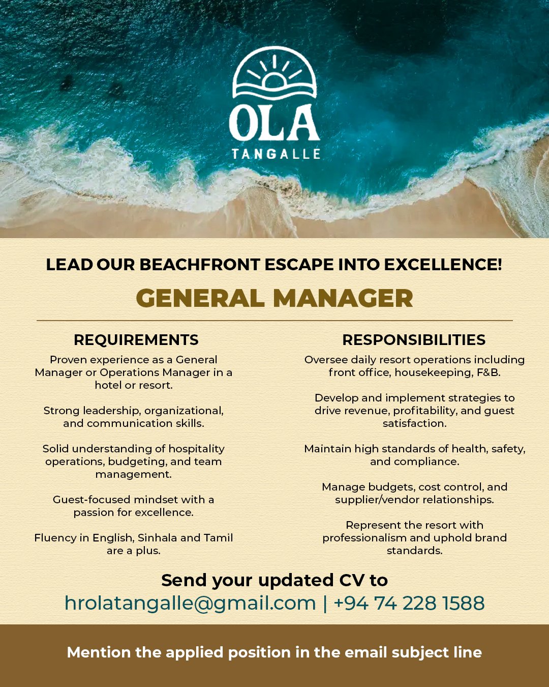 We’re hiring a dynamic General Manager to lead operations at Ola – Tangalle Beach Club.